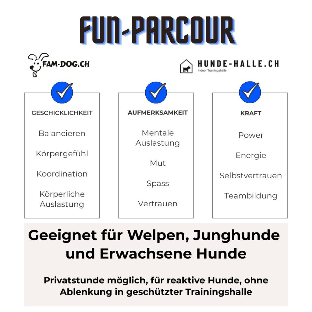 In der Hunde-halle.ch stellen wir einen Fun-Parcour auf, wo es für dich und deinen Hund um Geschicklichkeit, Balance, geistiger Auslastung und Kraft geht. Dein Hund lernt gemeinsam mit dir durch Vertrauen, Körpergefühl, Koordination, Aufmerksamkeit und Mut verschiedene Aufgaben zu lösen. Geeignet für Welpen, Junghunde und Erwachsene Hunde.